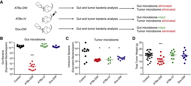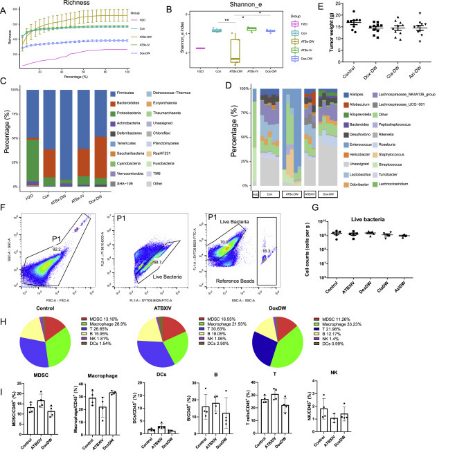通过测试不同的抗生素组合和给药途径来选择性地消除肿瘤驻留或肠道微生物群(图3A)。研究发现使用鸡尾酒抗生素(ATBx),通过饮用水(DW)可以有效清除肠道和肿瘤微生物菌群。当ATBx经尾静脉静脉注射时,肿瘤菌群被清除,而肠道菌群保持完整(图3B和3C)。通过DW给药穿透细胞膜的抗生素多西环素具有与ATBx-IV相似的效果(图3B和3C)。最重要的是,ATBx-IV和Dox-DW处理在肠道活菌数量、肠道微生物群谱和肿瘤免疫谱方面与对照组保持相当(图S3A S3D和S3F S3I)。结果发现ATBx-DW能有效地减缓自发MMTV-PyMT BTs的肿瘤生长(总肿瘤重量为15±对照组为0.5g,而ATBx-DW为11±0.8g),而单独用ATBx-IV或Dox-DW消除肿瘤微生物群并不影响肿瘤总重量(图3D)。这表明肠道菌群在肿瘤生长中起着重要作用,而肿瘤菌群则不然。
